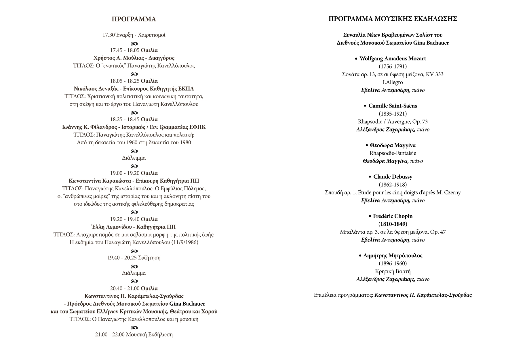 20.40 – 21.00 Κωνσταντίνος Καράμπελας-Σγούρδας – Πρόεδρος Διεθνούς Μουσικού Σωματείου Τζίνα Μπαχάουερ και του Σωματείου Ελλήνων Κριτικών Μουσικής, Θεάτρου και Χορού, ΤΙΤΛΟΣ: Ο Παναγιώτης Κανελλόπουλος και η μουσική
